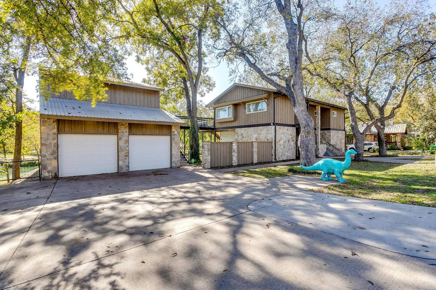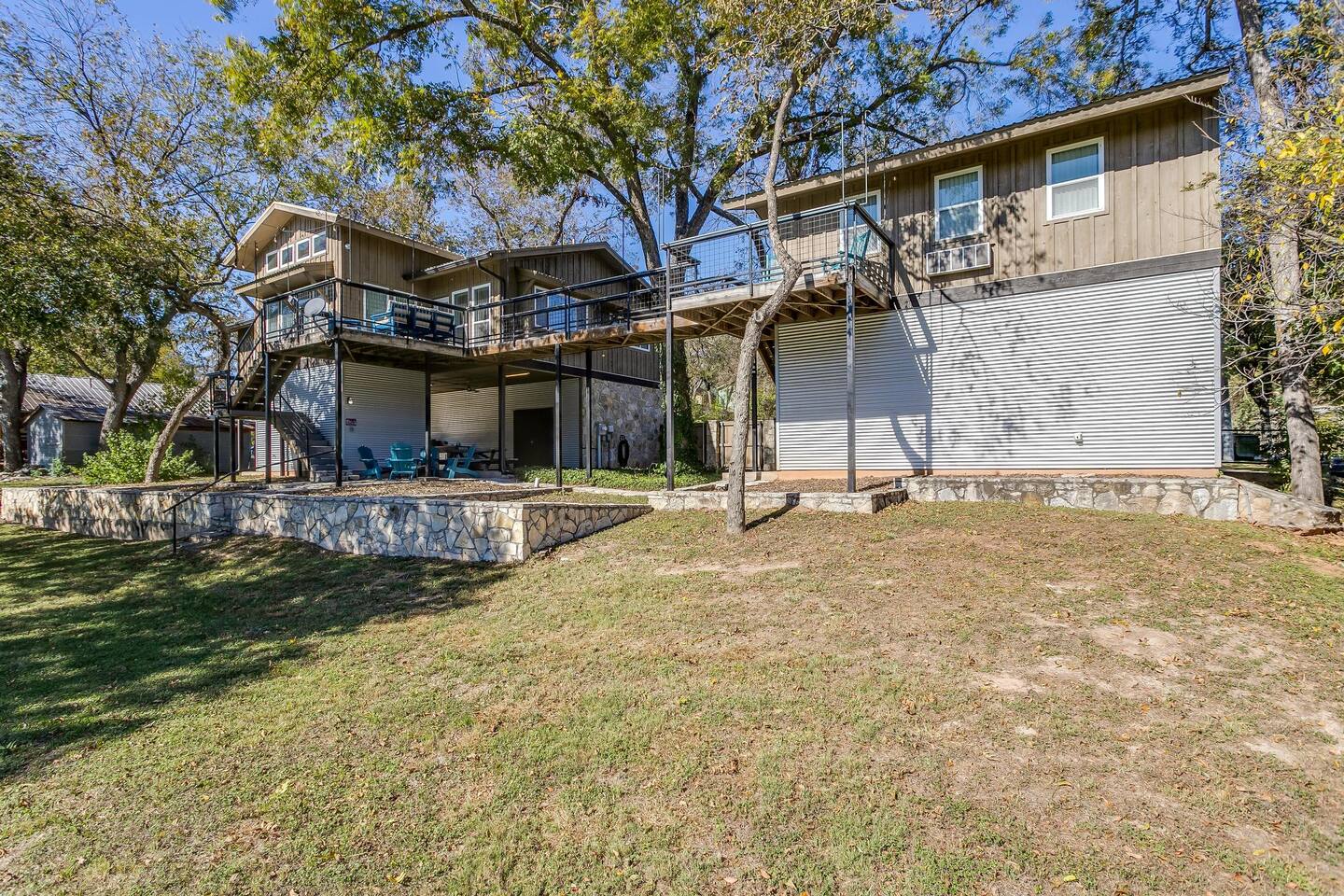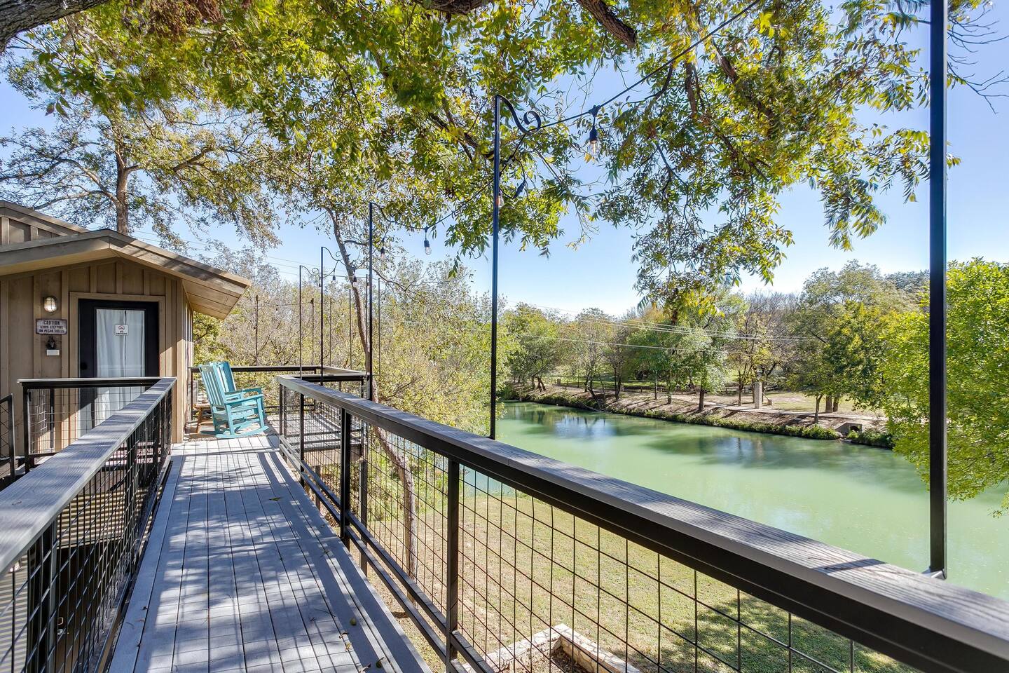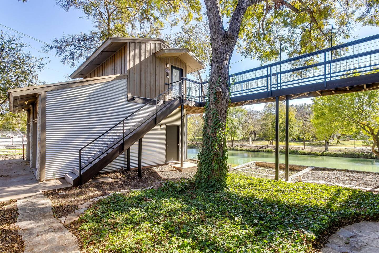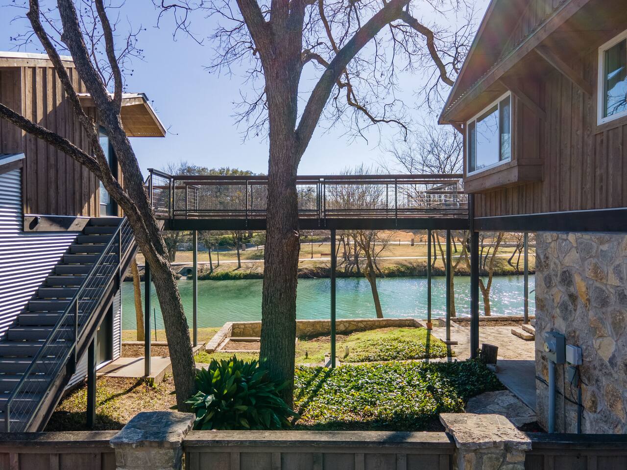 This unique home features two connected dwellings, joined by a scenic upstairs walkway, offering the perfect blend of privacy and shared space—ideal for families, couples, or friends traveling together. Main Living Space Highlights: • Two serene bedrooms, both with stunning views of the tranquil Paluxy River • Fully stocked kitchen—everything you need to cook at home • Keurig coffee maker with complimentary pods for your morning brew • Cozy living room with a 65-inch Smart TV—perfect for movie nights • Fun games for a relaxed evening in • Primary bedroom with a plush king bed, smart TV, and large walk-in closet • Spa-like primary en-suite bathroom with dual shower heads • Second bedroom with a comfortable queen bed and dedicated workspace • Second full bathroom with a relaxing bathtub Highlights of the Second Dwelling – “The Casita”: • Inviting queen-size bed for restful nights • Smart TV for streaming your favorites • Keurig coffee maker with pods for convenience • Private workspace—ideal for remote work or writing with a view • En-suite bathroom with a sleek walk-in shower • Private balcony overlooking the river—your own peaceful escape Outdoor Amenities: • Private access to the beautiful Paluxy River • Great fishing right from the backyard • Float and unwind with two provided innertubes • Cornhole for a little friendly competition • Wood-burning fire pit—first bundle of firewood included! • Outdoor kitchen with propane grill and sink for riverside meals • Picnic table perfect for alfresco dining • Balcony with outdoor seating to soak in the views and fresh air